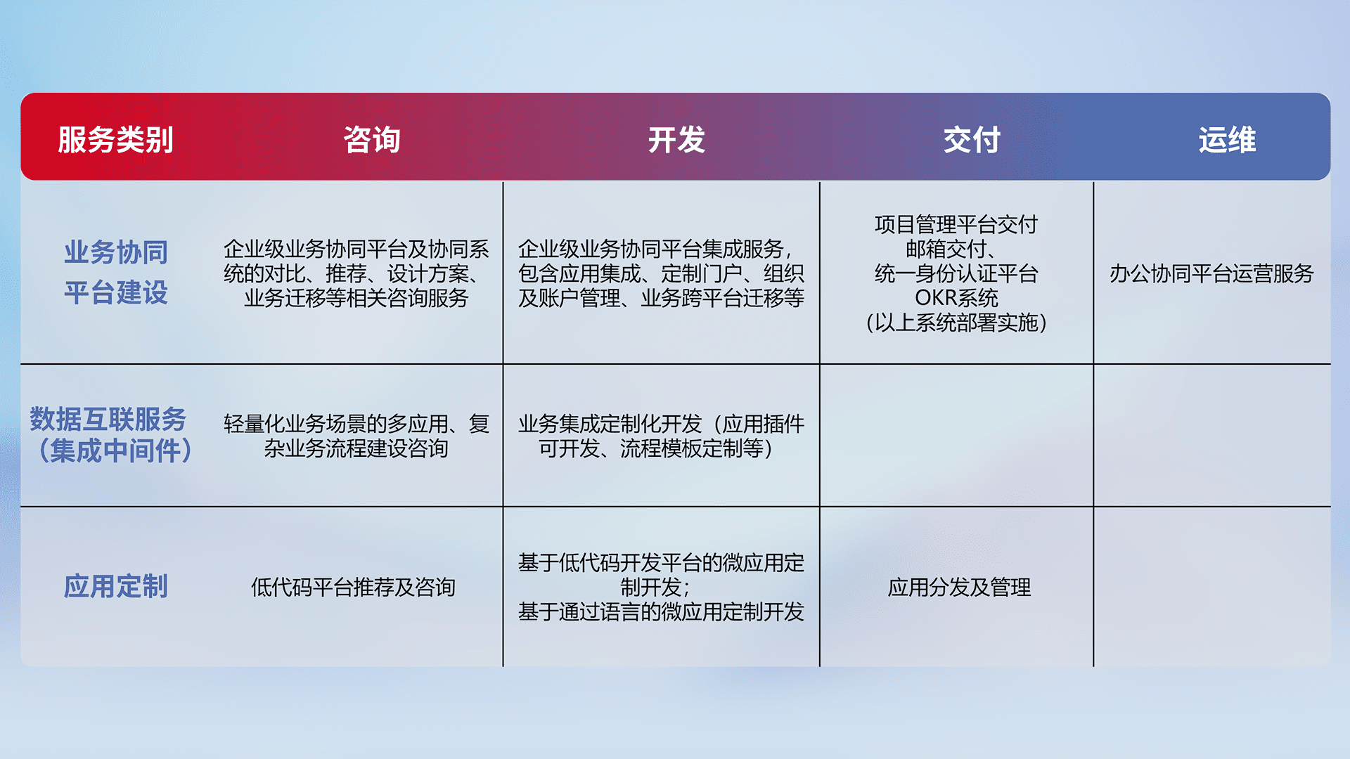 针对钉钉、、企微、、、、IDaas等平台级产品提供产品的规划、、方案、、、交付、、、定制化开发等服务,,实现如统一协同办公、、、、智能客户服务、、、混合会议管理、、、智能数据查询、、等业务场景,,,实现数字化转型。。