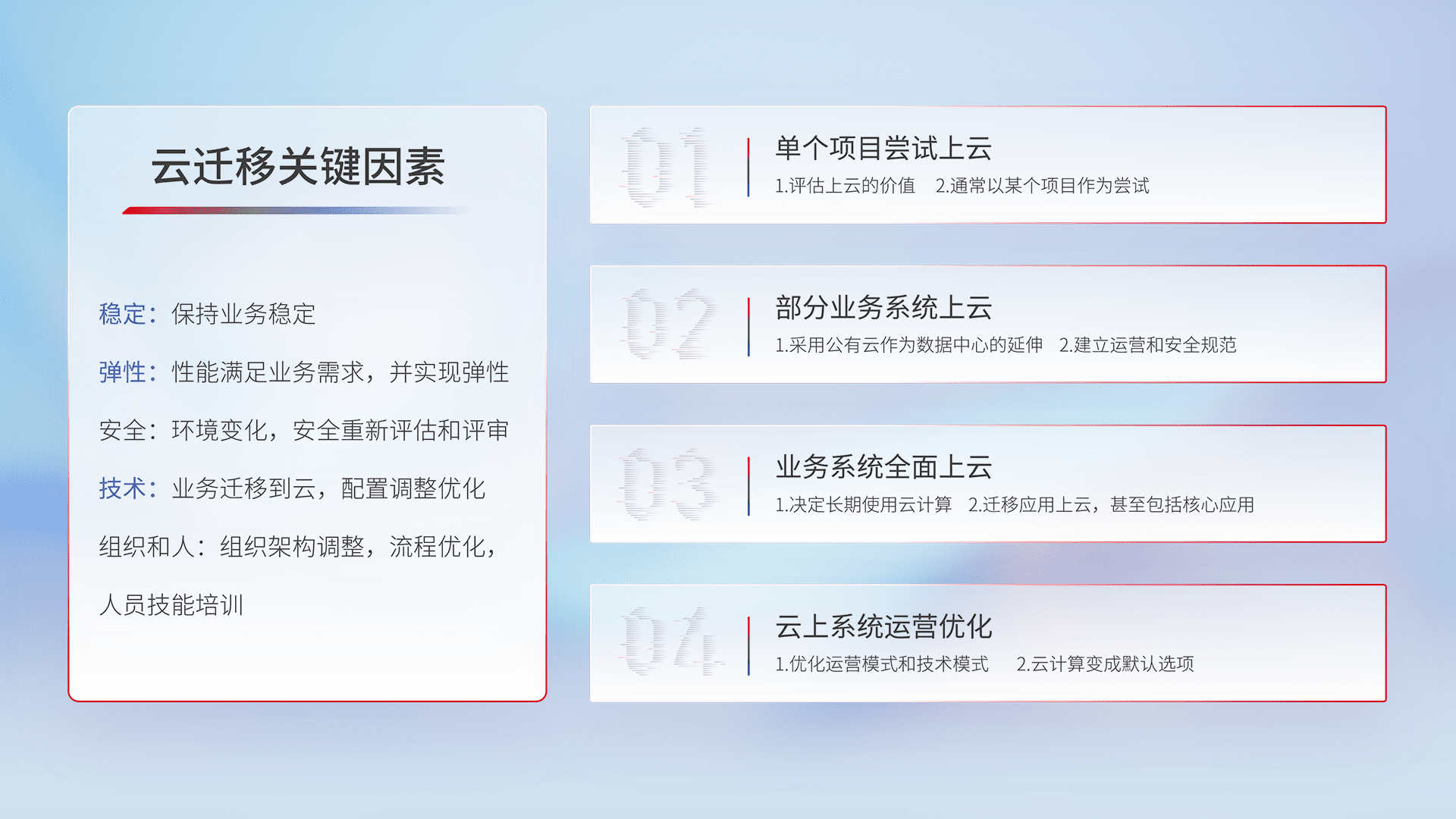 结合实际业务,,从规划设计、、、云平台选型、、云原生改造、、、、数据迁移、、、集成交付,,,,迁移全过程为客户识别最佳上云路径,,,,做好风险识别管理,,,,设计网络架构、、、身份权限、、、、安全审计合规、、操作审计、、、、日志审计、、、监控告警策略、、多站点容灾设计等,,,,对云上基础设施进行整体规划,,提升IT治理水平,,,以满足弹性、、、、高可用、、、、高性能的需求。。