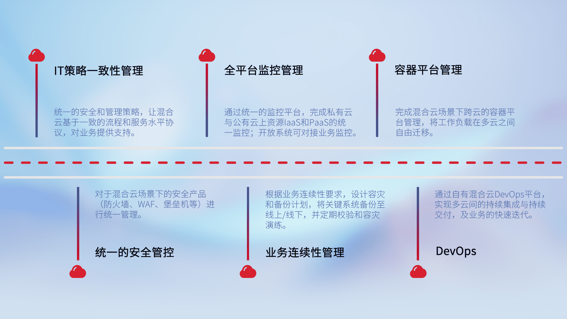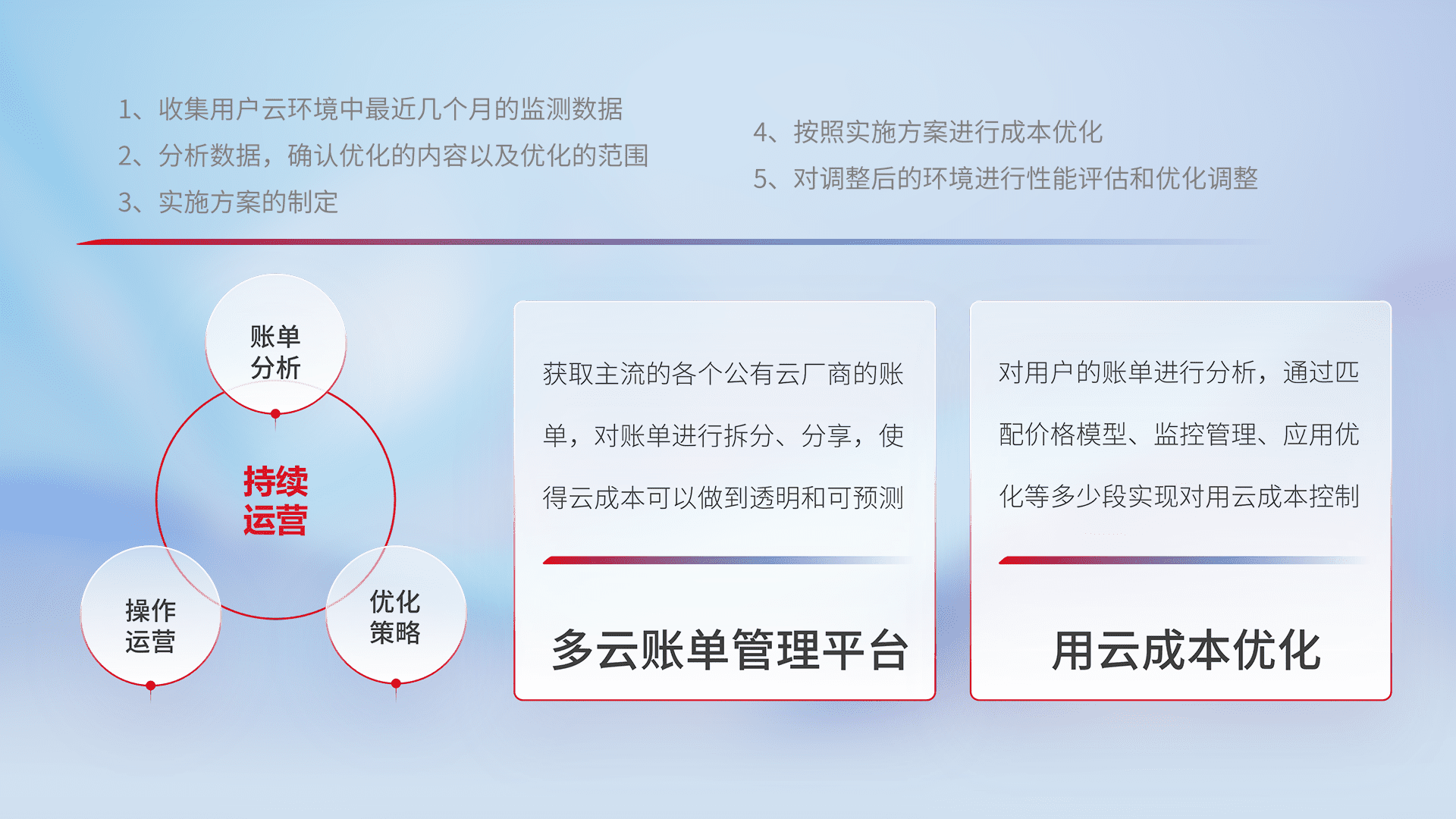 通过多云纳管,,,,以统一的资源数据模型把客户的云资源进行抽象和封装,,,进而实现对多云资源的统一操作,,保障云资源管理的可靠性、、、、稳定性与可用性。。。量身定制化运维内容,,,配置、、开发运维、、、补丁管理、、、备份、、、监控、、、认证和访问管理、、、、审计和日常巡检等,,保障在用云过程中的可靠度,,稳定度以及高可用率。。。。